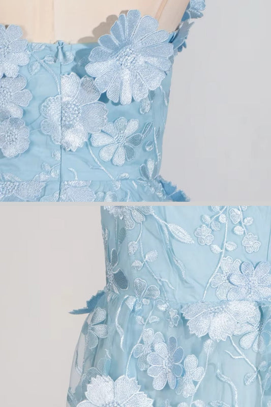Layered Sheer Dress With Fitted Waist And Floral Appliques - Light Blue