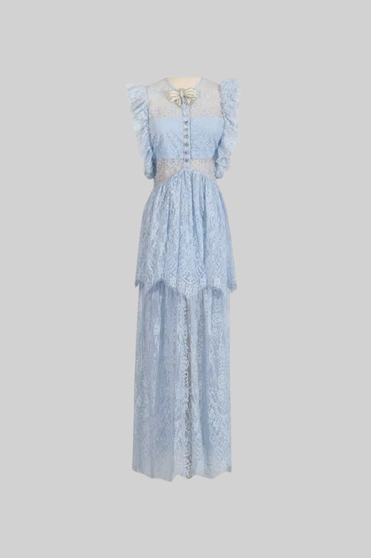 Elegant Vintage-Inspired Lace Dress With Ruffled Details And Layered Skirt - Blue