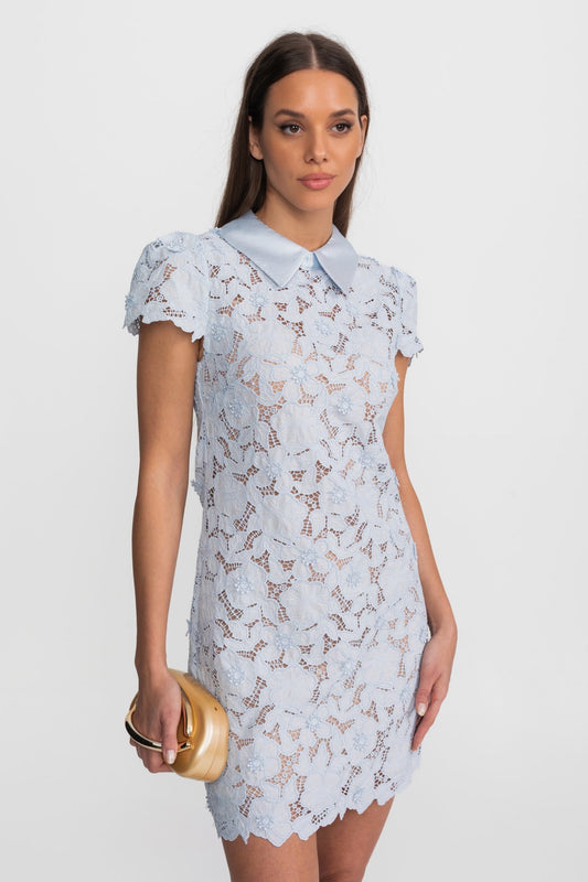 Floral Lace Mini Dress with Satin Collar – Light Blue