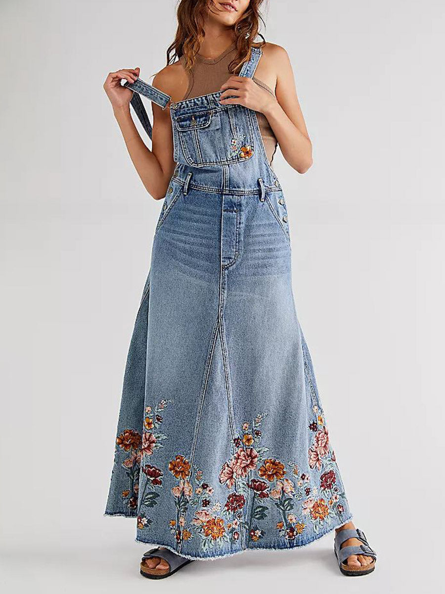 Channel timeless charm with a touch of boho flair in this beautifully embroidered denim skirtall. Crafted from soft, medium-wash denim, this piece blends the casual appeal of overalls with the feminine flow of a flared maxi skirt. Delicate floral embroidery blooms along the hem, adding a romantic, handcrafted feel. Whether layered with a tee for a playful daytime look or styled with a blouse for weekend wanderings, this skirtall is your new go-to statement piece.