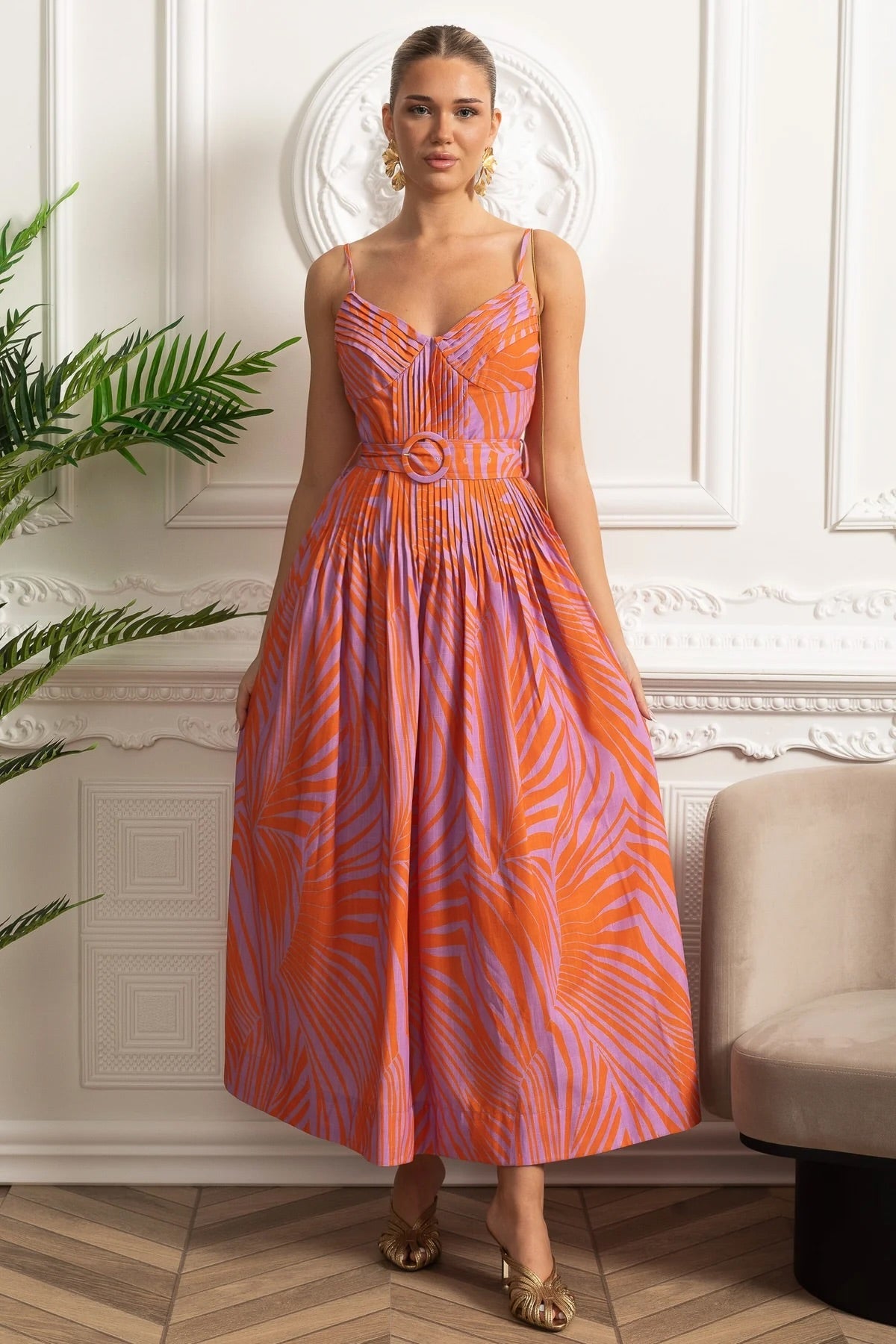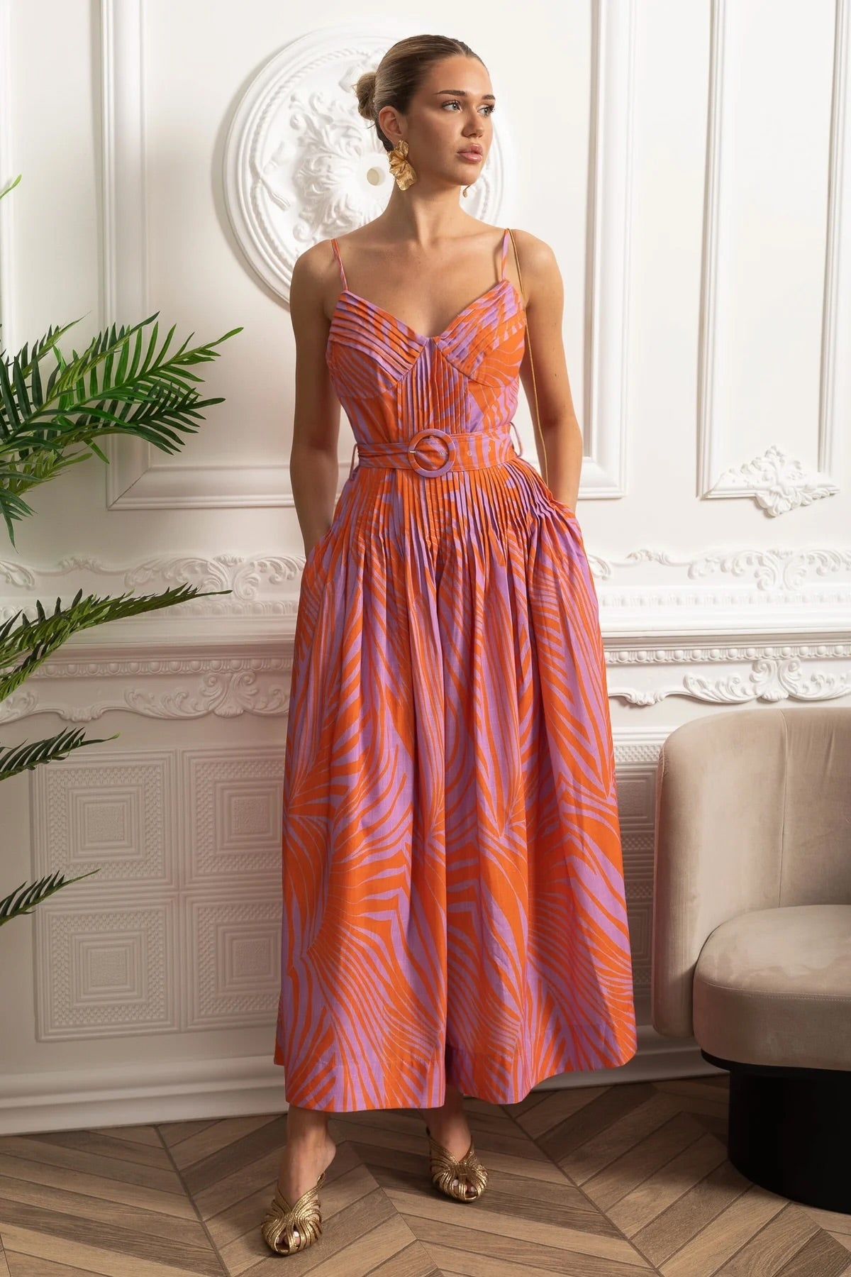 Red Pleated Bust Belted Midi Dress with Spaghetti Straps