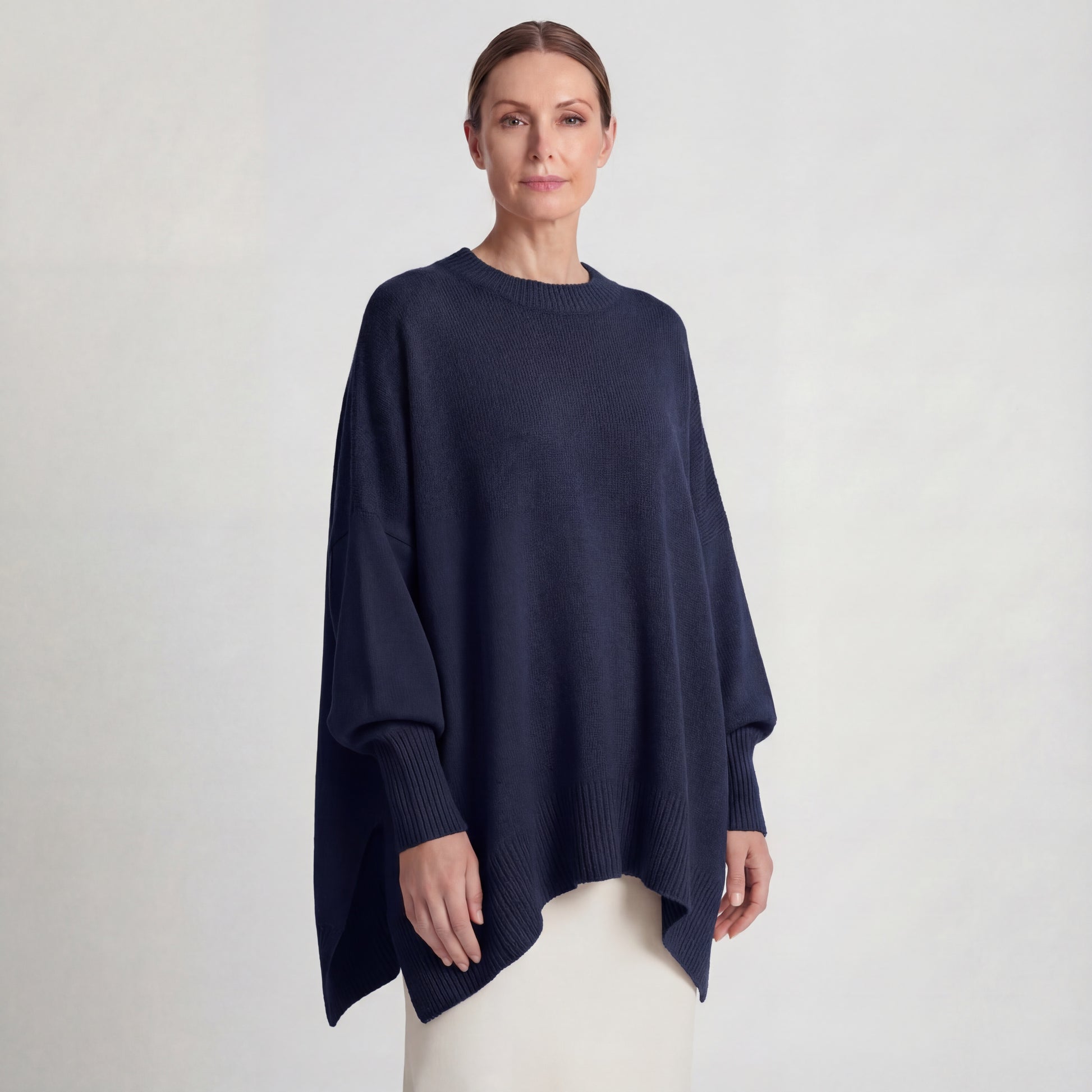 Clothing Detail: Crew neckline, dropped shoulders, oversized fit, long sleeves