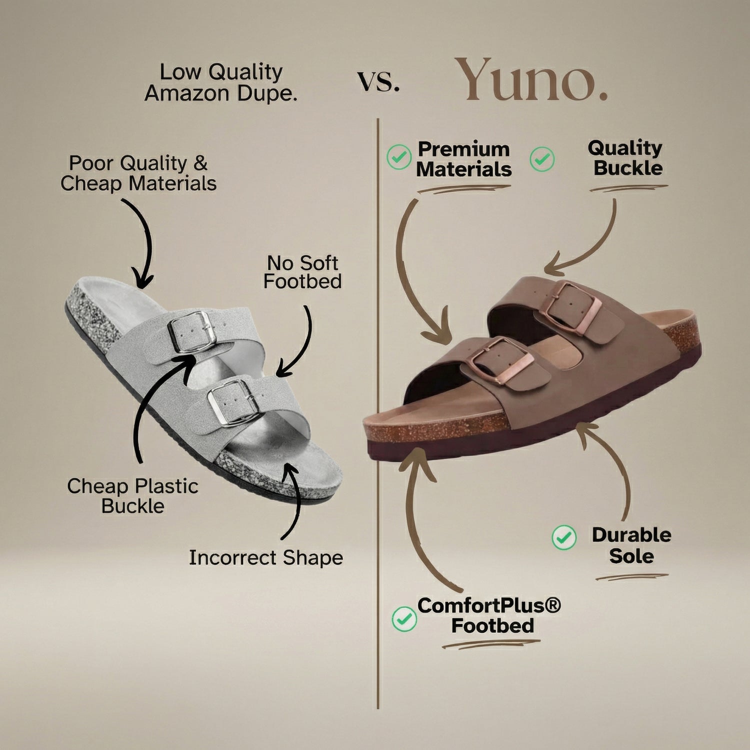 While low-quality dupes use stiff materials and cheap plastic hardware, Yuno is built for real comfort, durability, and everyday style.
